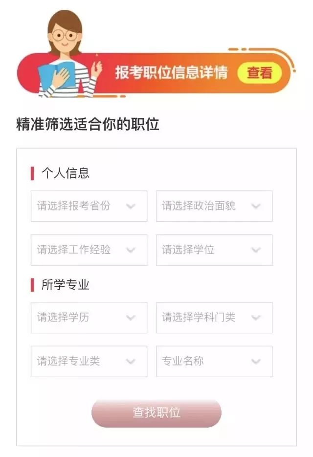 那你一定是公考新手!公考老司机都在使用职位筛选神器——“华图职位库”智能系统。你只需要输入个人条件,就能快速匹配职位,查看职位历年报录比、竞争比例、历年分数线等信息。让职位选择更简单。