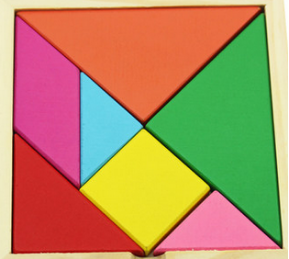 七巧板是由一个正方形、五个三角形、一个平行四边形组成的七个小纸片(或小木片、塑料片等)。七巧板中蕴含着许多有趣的数学知识和技巧,它可以摆出千姿百态的图形,在小学数学的教学过程中的作用不可忽视。七巧板在图形的认识、角的认识、面积的教学等内容的教学过程中都起到非常重要的作用。例如在学生认识了基本的平面图形之后,教师可以出示一块七巧板,让学生说出其中图形的一块图形或者几块拼成的图形的名称;在学生学习了角的分类之后,可以试着让学生找出七巧板中的直角、锐角或钝角。学生在感受七巧板好玩的同时,也可以巩固所学内容。除此之外,七巧板在数与代数的分数教学过程中也有所运用。