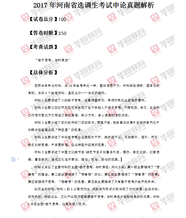 2017河南选调生考试已经结束,根据考生的回忆情况,河南华图教研老师对河南选调生考试进行申论解析。下面看详细的解析。